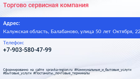 Торгово-сервисная компания по адресу Калужская область, Балабаново, улица 50 лет Октября, 22 в дальнейшем Организация, размещена в следующих категориях: