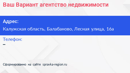 Ваш Вариант, агентство недвижимости по адресу Калужская область, Балабаново, Лесная улица, 16а в дальнейшем Организация, размещена в следующих категориях: