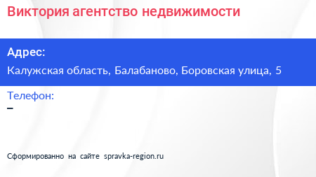 Виктория, агентство недвижимости по адресу Калужская область, Балабаново, Боровская улица, 5 в дальнейшем Организация, размещена в следующих категориях: