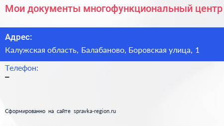 Мои документы, многофункциональный центр по адресу Калужская область, Балабаново, Боровская улица, 1 в дальнейшем Организация, размещена в следующих категориях: