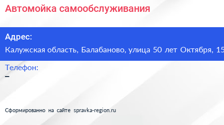 Автомойка самообслуживания по адресу Калужская область, Балабаново, улица 50 лет Октября, 15а в дальнейшем Организация, размещена в следующих категориях: