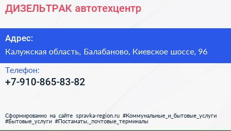 ДИЗЕЛЬТРАК, автотехцентр по адресу Калужская область, Балабаново, Киевское шоссе, 96 в дальнейшем Организация, размещена в следующих категориях: