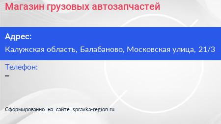 Магазин грузовых автозапчастей по адресу Калужская область, Балабаново, Московская улица, 21/3 в дальнейшем Организация, размещена в следующих категориях: