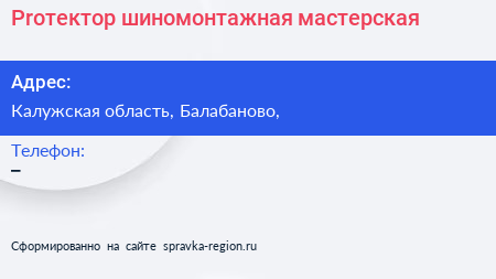 Proтектор, шиномонтажная мастерская по адресу Калужская область, Балабаново, в дальнейшем Организация, размещена в следующих категориях: