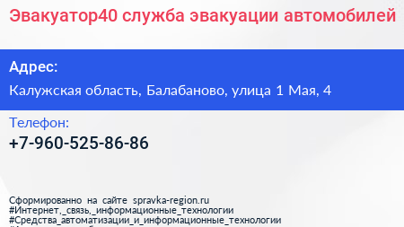 Эвакуатор40, служба эвакуации автомобилей по адресу Калужская область, Балабаново, улица 1 Мая, 4 в дальнейшем Организация, размещена в следующих категориях: