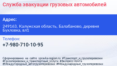 Служба эвакуации грузовых автомобилей по адресу 249163, Калужская область, Балабаново, деревня Бухловка, вл1 в дальнейшем Организация, размещена в следующих категориях: