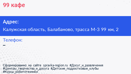 99, кафе по адресу Калужская область, Балабаново, трасса М-3 99 км, 2 в дальнейшем Организация, размещена в следующих категориях: