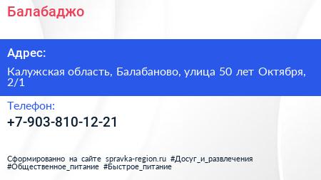 Балабаджо по адресу Калужская область, Балабаново, улица 50 лет Октября, 2/1 в дальнейшем Организация, размещена в следующих категориях: