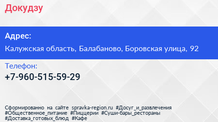 Докудзу по адресу Калужская область, Балабаново, Боровская улица, 92 в дальнейшем Организация, размещена в следующих категориях: