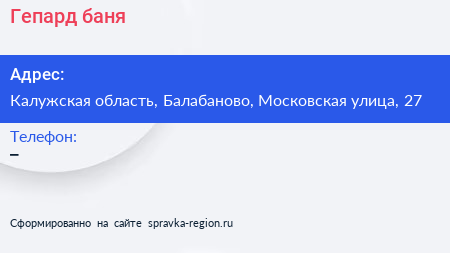 Гепард, баня по адресу Калужская область, Балабаново, Московская улица, 27 в дальнейшем Организация, размещена в следующих категориях: