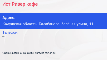 Ист-Ривер, кафе по адресу Калужская область, Балабаново, Зелёная улица, 11 в дальнейшем Организация, размещена в следующих категориях: