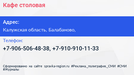 Кафе-столовая по адресу Калужская область, Балабаново, в дальнейшем Организация, размещена в следующих категориях: