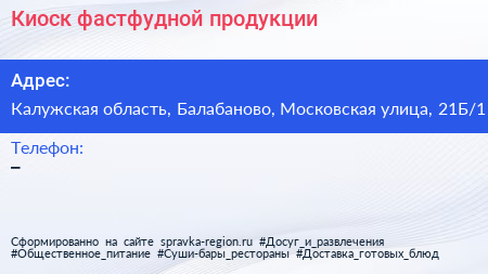 Киоск фастфудной продукции по адресу Калужская область, Балабаново, Московская улица, 21Б/1 в дальнейшем Организация, размещена в следующих категориях: