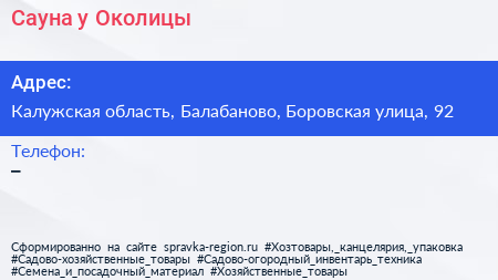 Сауна у Околицы по адресу Калужская область, Балабаново, Боровская улица, 92 в дальнейшем Организация, размещена в следующих категориях:
