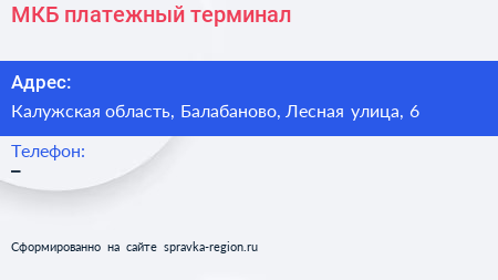 МКБ, платежный терминал по адресу Калужская область, Балабаново, Лесная улица, 6 в дальнейшем Организация, размещена в следующих категориях: