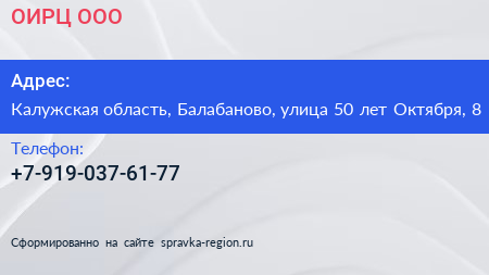 ОИРЦ, ООО по адресу Калужская область, Балабаново, улица 50 лет Октября, 8 в дальнейшем Организация, размещена в следующих категориях:
