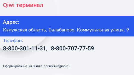 Qiwi, терминал по адресу Калужская область, Балабаново, Коммунальная улица, 9 в дальнейшем Организация, размещена в следующих категориях: