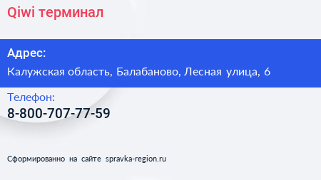 Qiwi, терминал по адресу Калужская область, Балабаново, Лесная улица, 6 в дальнейшем Организация, размещена в следующих категориях: