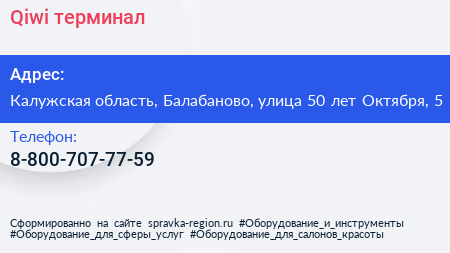 Qiwi, терминал по адресу Калужская область, Балабаново, улица 50 лет Октября, 5 в дальнейшем Организация, размещена в следующих категориях:
