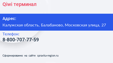 Qiwi, терминал по адресу Калужская область, Балабаново, Московская улица, 27 в дальнейшем Организация, размещена в следующих категориях: