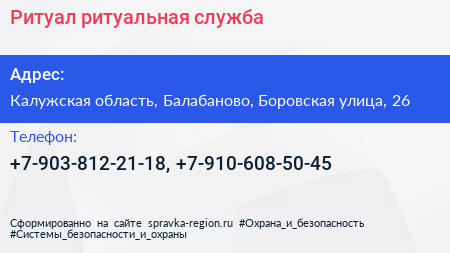 Ритуал, ритуальная служба по адресу Калужская область, Балабаново, Боровская улица, 26 в дальнейшем Организация, размещена в следующих категориях: