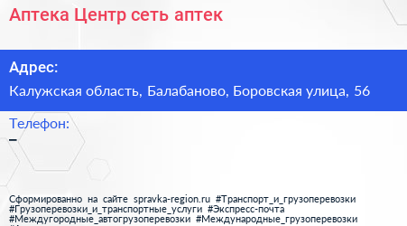 Аптека-Центр, сеть аптек по адресу Калужская область, Балабаново, Боровская улица, 56 в дальнейшем Организация, размещена в следующих категориях: