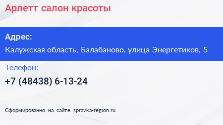 Арлетт, салон красоты по адресу Калужская область, Балабаново, улица Энергетиков, 5 в дальнейшем Организация, размещена в следующих категориях: