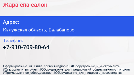 Жара, спа-салон по адресу Калужская область, Балабаново, в дальнейшем Организация, размещена в следующих категориях: