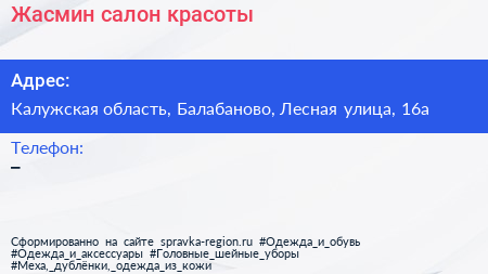 Жасмин, салон красоты по адресу Калужская область, Балабаново, Лесная улица, 16а в дальнейшем Организация, размещена в следующих категориях: