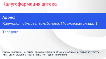 Калугафармация, аптека по адресу Калужская область, Балабаново, Московская улица, 1 в дальнейшем Организация, размещена в следующих категориях: