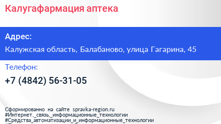 Калугафармация, аптека по адресу Калужская область, Балабаново, улица Гагарина, 45 в дальнейшем Организация, размещена в следующих категориях: