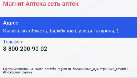 Магнит Аптека, сеть аптек по адресу Калужская область, Балабаново, улица Гагарина, 1 в дальнейшем Организация, размещена в следующих категориях: