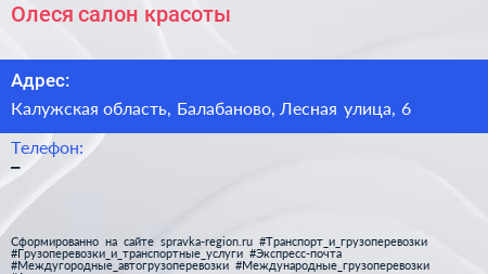 Олеся, салон красоты по адресу Калужская область, Балабаново, Лесная улица, 6 в дальнейшем Организация, размещена в следующих категориях: