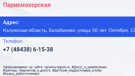 Парикмахерская по адресу Калужская область, Балабаново, улица 50 лет Октября, 13 в дальнейшем Организация, размещена в следующих категориях: