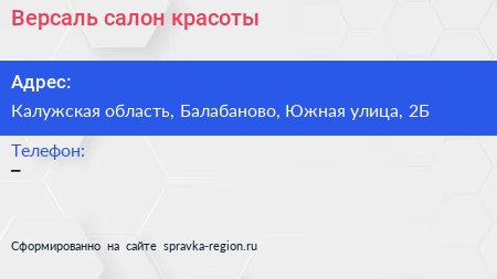 Версаль, салон красоты по адресу Калужская область, Балабаново, Южная улица, 2Б в дальнейшем Организация, размещена в следующих категориях: