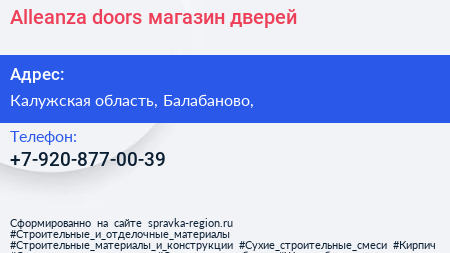 Alleanza doors, магазин дверей по адресу Калужская область, Балабаново, в дальнейшем Организация, размещена в следующих категориях: