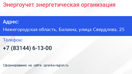 Энергоучет, энергетическая организация по адресу Нижегородская область, Балахна, улица Свердлова, 25 в дальнейшем Организация, размещена в следующих категориях: