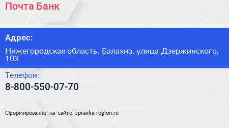 Почта Банк по адресу Нижегородская область, Балахна, улица Дзержинского, 103 в дальнейшем Организация, размещена в следующих категориях: