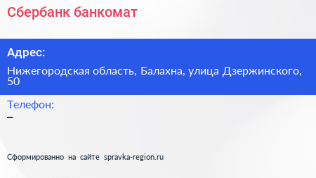 Сбербанк, банкомат по адресу Нижегородская область, Балахна, улица Дзержинского, 50 в дальнейшем Организация, размещена в следующих категориях: