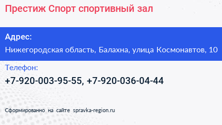 Престиж-Спорт, спортивный зал по адресу Нижегородская область, Балахна, улица Космонавтов, 10 в дальнейшем Организация, размещена в следующих категориях: