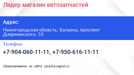 Лидер, магазин автозапчастей по адресу Нижегородская область, Балахна, проспект Дзержинского, 53 в дальнейшем Организация, размещена в следующих категориях: