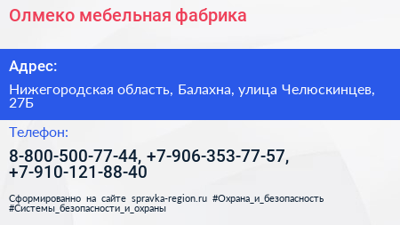 Олмеко, мебельная фабрика по адресу Нижегородская область, Балахна, улица Челюскинцев, 27Б в дальнейшем Организация, размещена в следующих категориях: