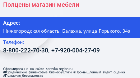 Полцены, магазин мебели по адресу Нижегородская область, Балахна, улица Горького, 34а в дальнейшем Организация, размещена в следующих категориях: