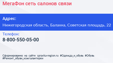 МегаФон, сеть салонов связи по адресу Нижегородская область, Балахна, Советская площадь, 22 в дальнейшем Организация, размещена в следующих категориях: