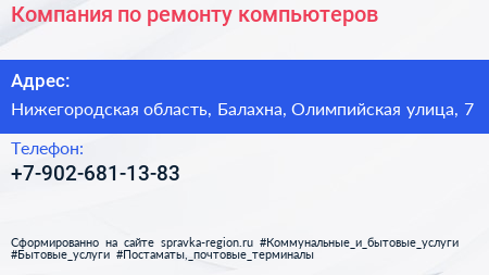 Компания по ремонту компьютеров по адресу Нижегородская область, Балахна, Олимпийская улица, 7 в дальнейшем Организация, размещена в следующих категориях: