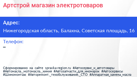 Артстрой, магазин электротоваров по адресу Нижегородская область, Балахна, Советская площадь, 16 в дальнейшем Организация, размещена в следующих категориях: