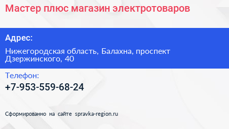 Мастер плюс, магазин электротоваров по адресу Нижегородская область, Балахна, проспект Дзержинского, 40 в дальнейшем Организация, размещена в следующих категориях: