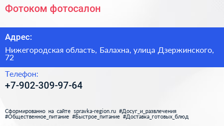 Фотоком, фотосалон по адресу Нижегородская область, Балахна, улица Дзержинского, 72 в дальнейшем Организация, размещена в следующих категориях: