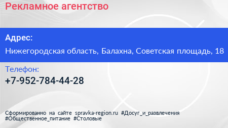 Рекламное агентство по адресу Нижегородская область, Балахна, Советская площадь, 18 в дальнейшем Организация, размещена в следующих категориях: