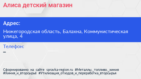 Алиса, детский магазин по адресу Нижегородская область, Балахна, Коммунистическая улица, 4 в дальнейшем Организация, размещена в следующих категориях:
